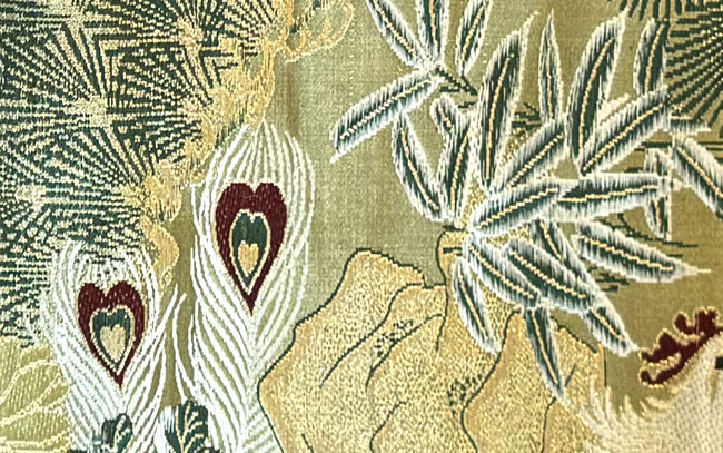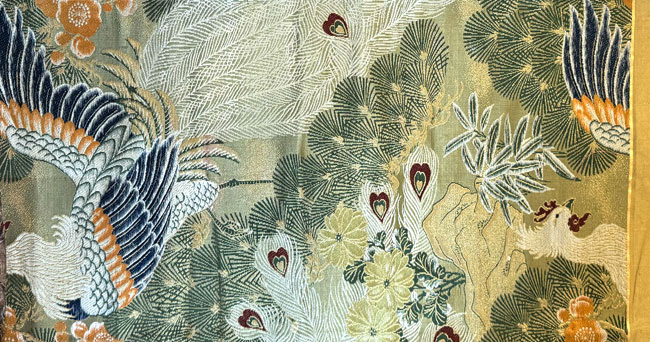 Silk off-cut from a maru obi. Woven bird and pine tree design.