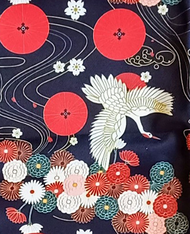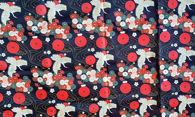 This is a large piece of black printed fabric with a Japanese design. It is a synthetic fabric which is light, but firm and lacking in softness and drape. Great for furnishings eg cushions, table runners etc.