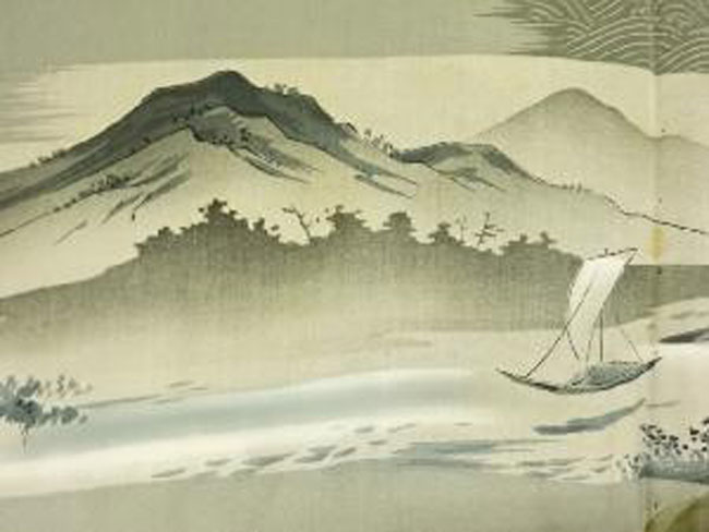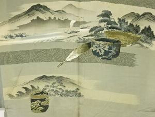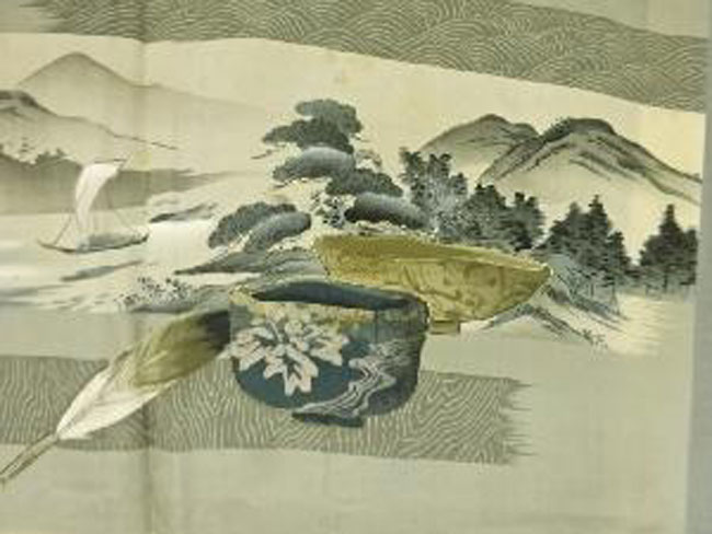 Interesting man's smooth woven blue and dark grey silk haori with silk lining featuring Japanese scenery, boats on a river, rice bowls and so on.The are lots of metallic gold outlines and highlights. A generous 37 inches long and 54 inches from sleeve edge to sleeve edge. Beautiful to wear or display.