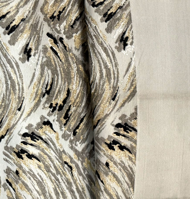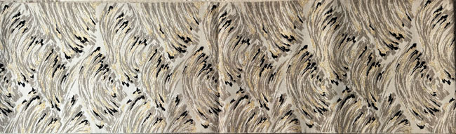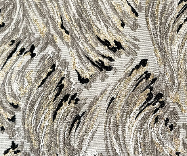 unusual woven cream silk obi with wave design in black, gold and coffee coloured threads on a cream silk. The reverse is a plain cream silk. It would look terrific as a wall hanging, a table runner or across the end of a bed. This obi does not have a stiff inner core.