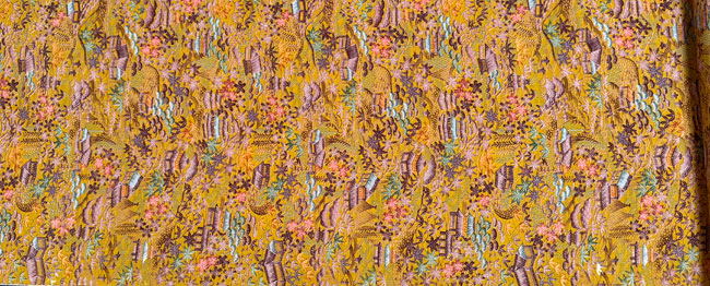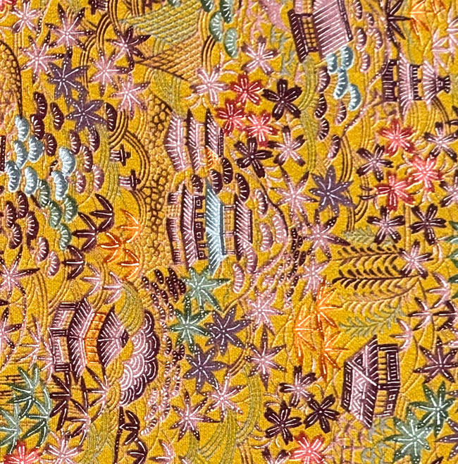 Beautiful golden yellow smooth and soft kimono silk with images of country scenes. Great drape.