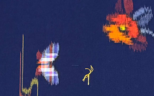 Vibrant blue wool with woven floral and butterfly design. Fully reversible ikat.