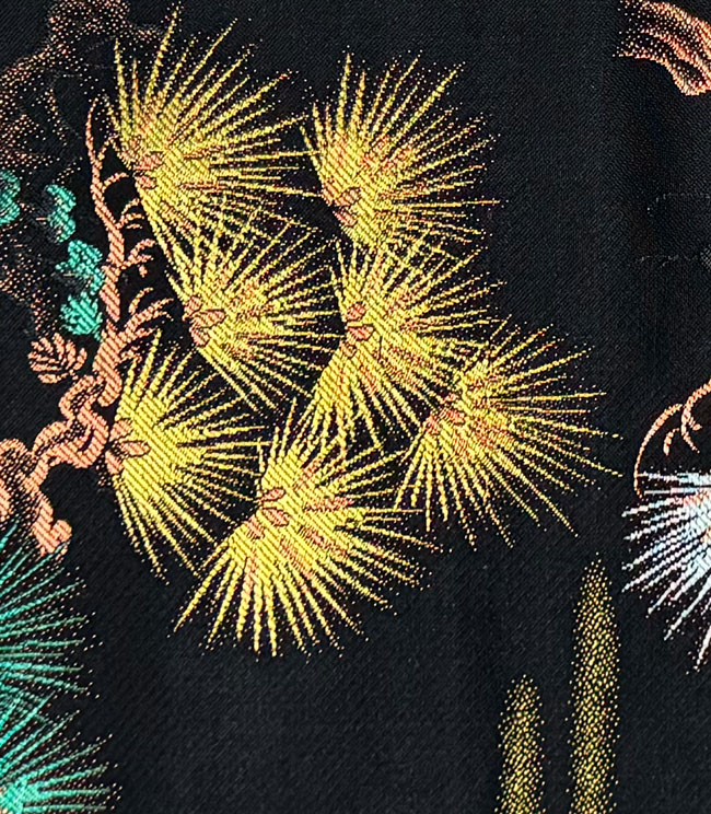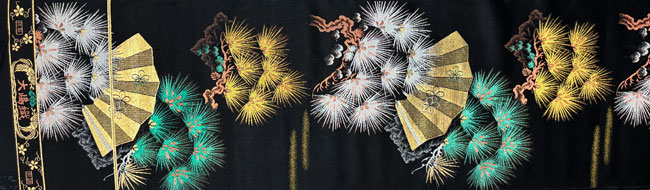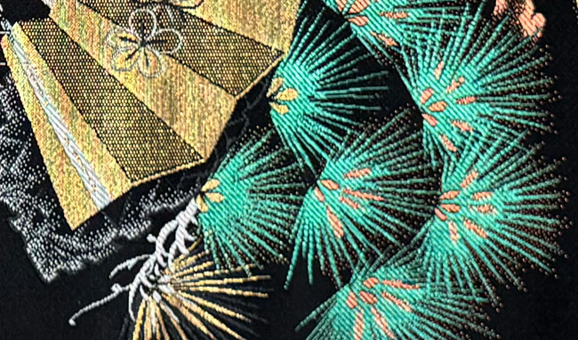 Attractive black silk obi bolt woven in rich gold, silver and green threads. It is 180 inches long of which 80 inches is patterned. The remainder is black silk. This bolt is from a used obi.