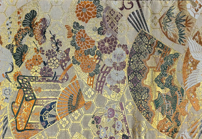 Cream silk obi piece with woven fans, cranes, bamboo, pine tress, royal carriages and so on. This pieces is double value as the it is backed (and detached) with an identical piece giving you two pieces of what you see in the full image photograph.