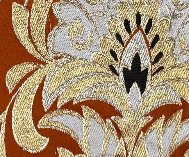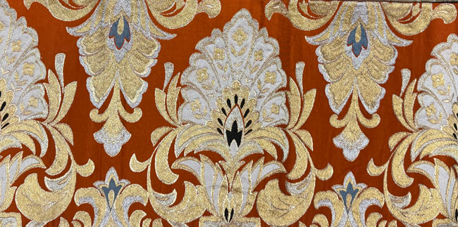 Burnt orange silk obi piece with metallic gold motif designs. This piece is double sided and can be unstitched to produce a patterned side and a plain orange silk side.