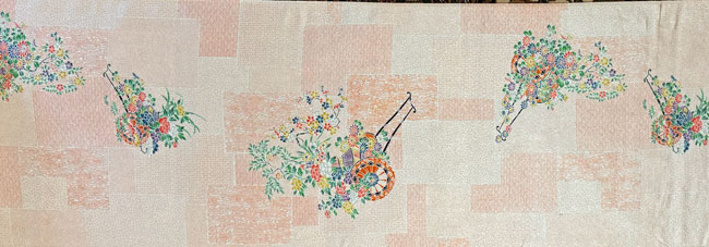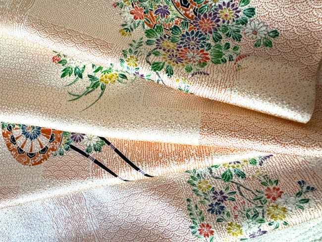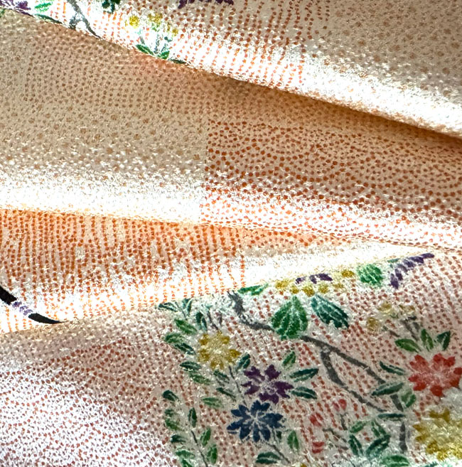 Soft and silky fine kimono silk with a patchwork design with a barrow and flowers overlaid design. Beautiful drape.