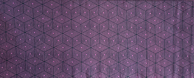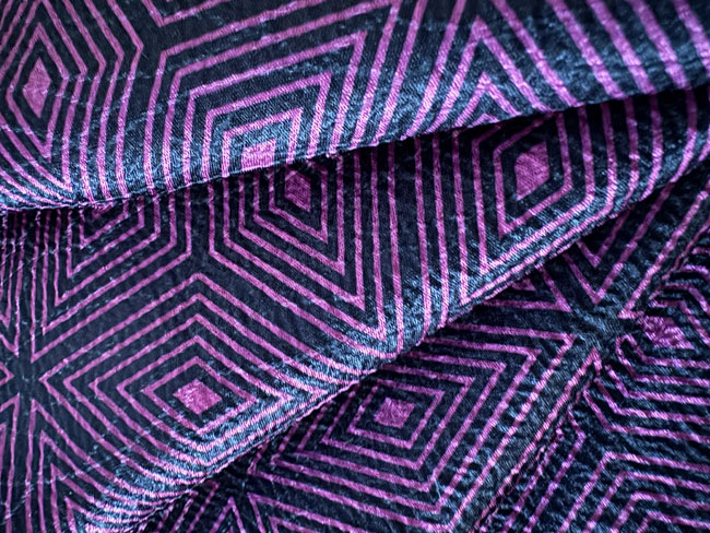 Soft and silky quality textured synthetic with geometric design in pink and blue.