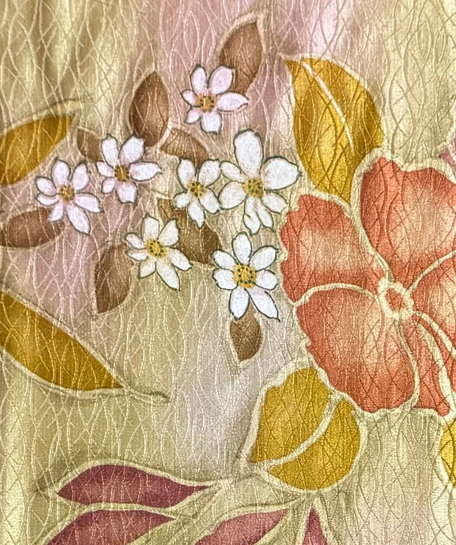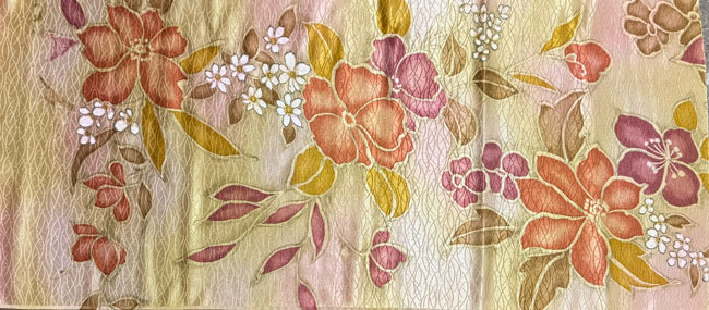 Soft and silky kimono silk with all over woven design with overlaid floral design in autumn tones.