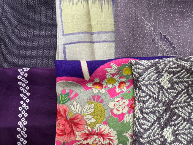 6 pieces of vintage Japanese kimono silk, all different and measuring approximately 12 x 14 inches or the equivalent.