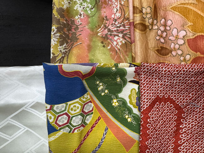6 pieces of vintage Japanese kimono silk, all different and measuring approximately 12 x 14 inches or the equivalent.