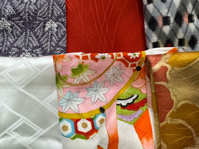 6 pieces of vintage Japanese kimono silk, all different and measuring approximately 12 x 14 inches or the equivalent.