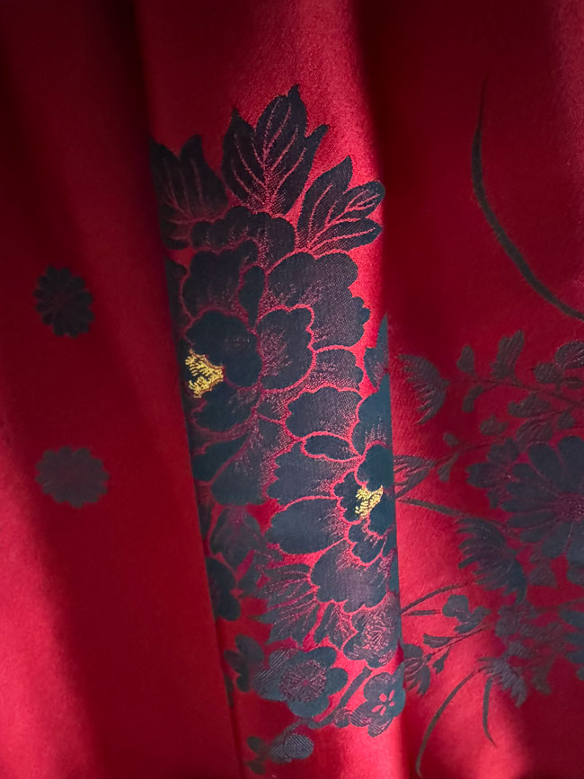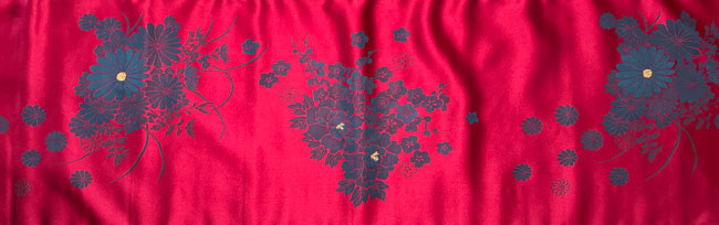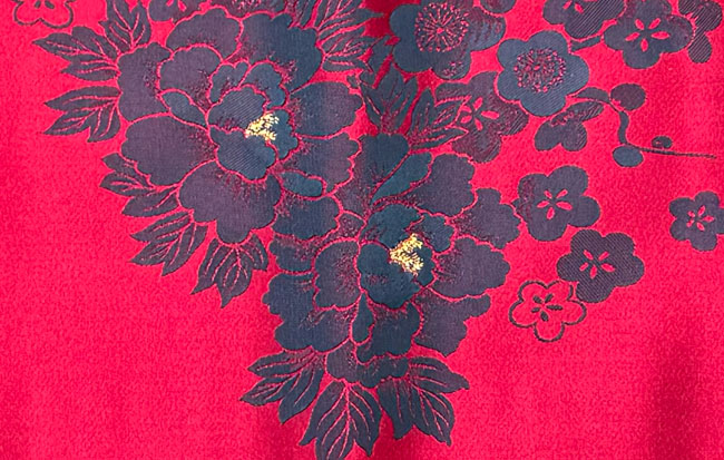 Shiny cherry red quality synthetic with traditional grey/black flowers, some of which have added metallic gold centres.