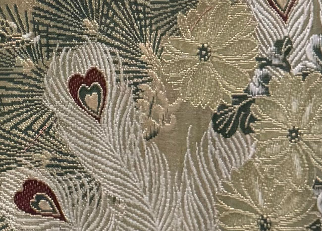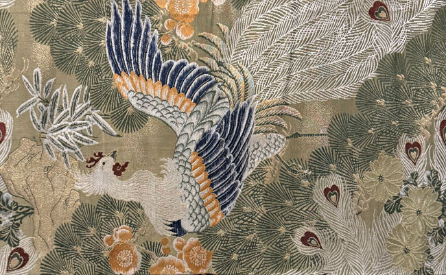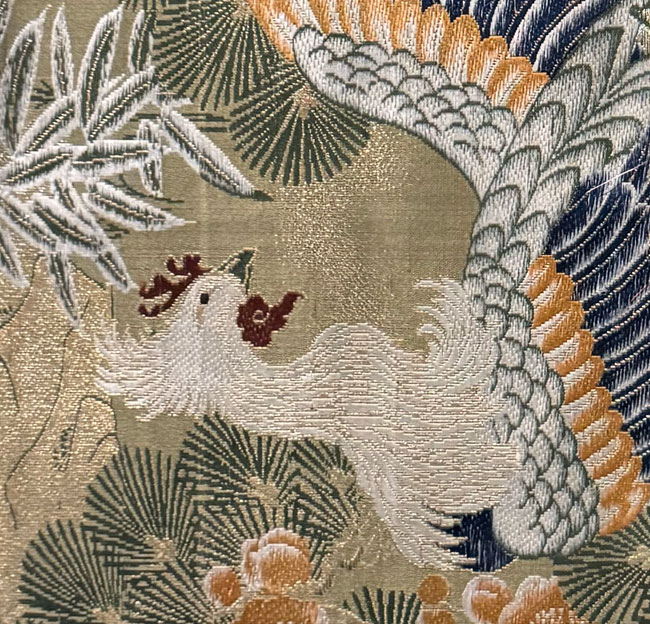 Silk off-cut from a maru obi. Woven bird and pine tree design.