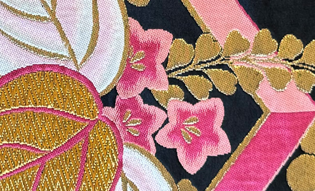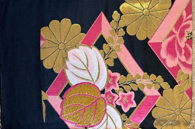 Beautiful obi piece taken from a damaged fukuro obi. Black silk with woven design in metallic gold , pink and cherry red. Still with plain back silk backing.