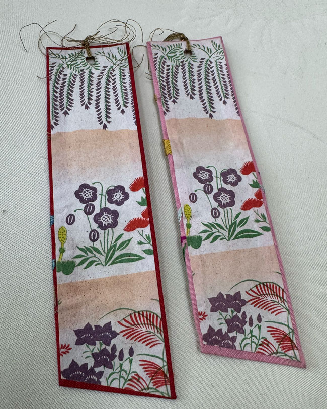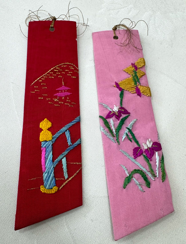 Fabric covering firm card book marks. Both pieces are beautifully hand embroidered and backed with patterned cotton fabric. Both are finished with a fine gold tassel.