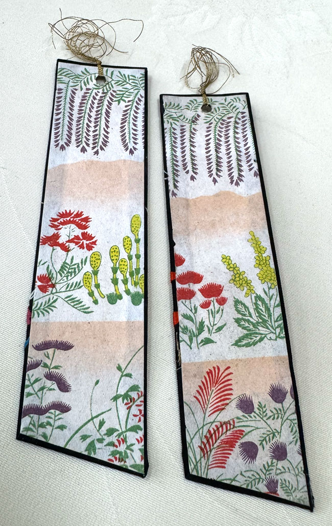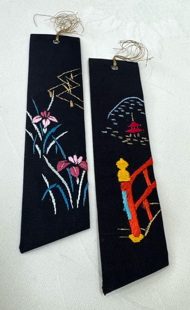 Fabric covering firm card book marks. Both pieces are beautifully hand embroidered and backed with patterned cotton fabric. Both are finished with a fine gold tassel.