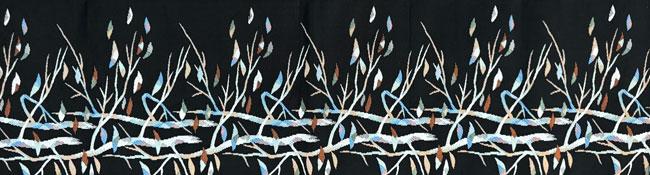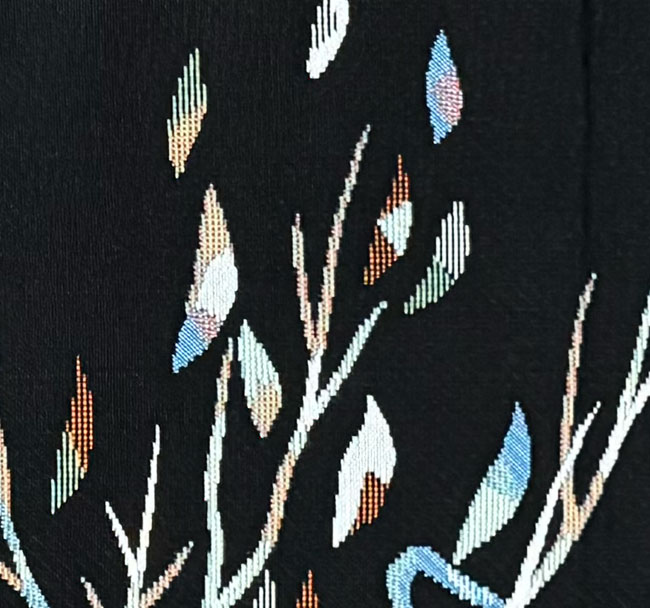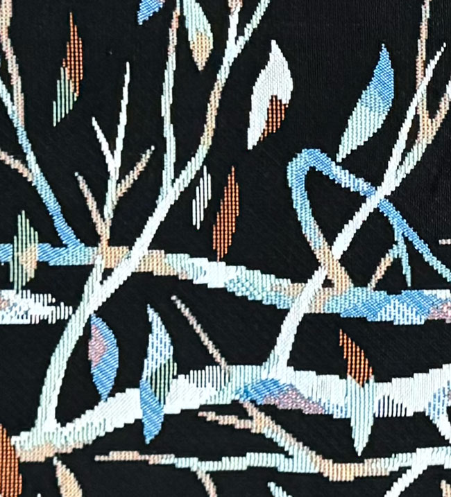 This obi bolt has been used, but is still in good condition. It is 139 inches in length of which 80 inches is patterned and the other 50 inches is plain black. The black section shows evidence of a previous horizontal fold line.