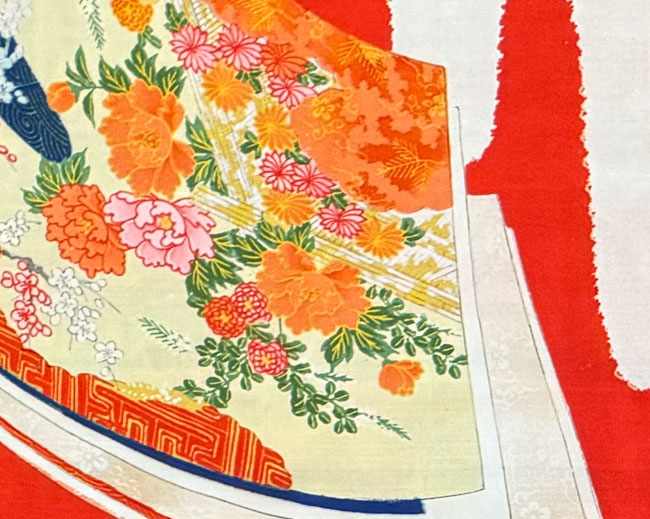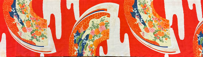 Fine red silk with dyed floral fan design. Suitable weight for clothing and linings.