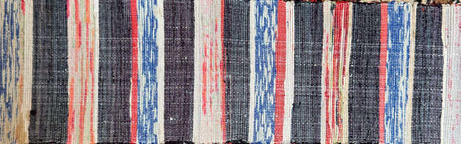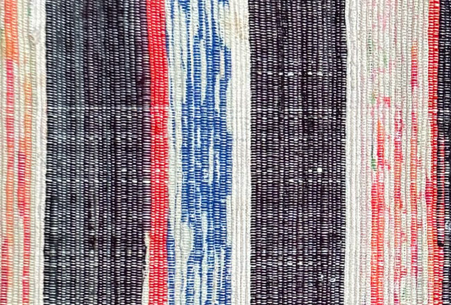Blue, black red and cream hand made sakiori obi. Woven vintage cotton with fine threads and finely rolled cotton fabric strips.