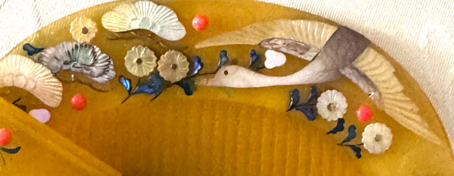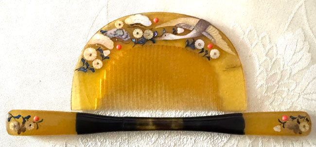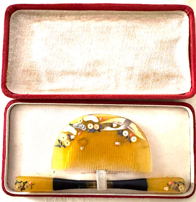 This is an exceptionally beautiful Kogai and Kushi Set in it's original velvet, silk lined box. It is inlaid with mother of pearl and tiny orange beads and is in excellent condition.