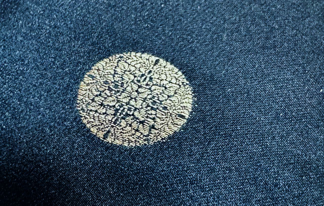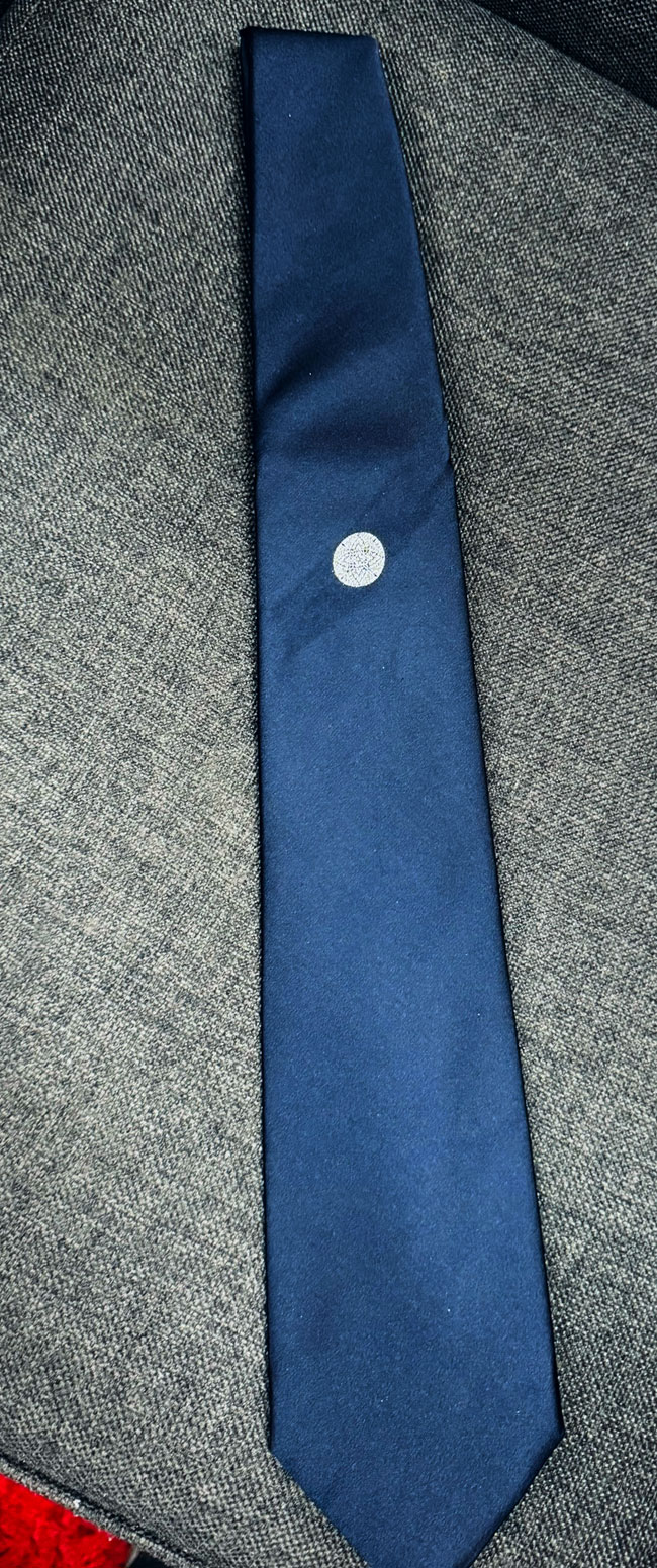 Deep blue quality new silk Japanese tie with embroidered silver motif.