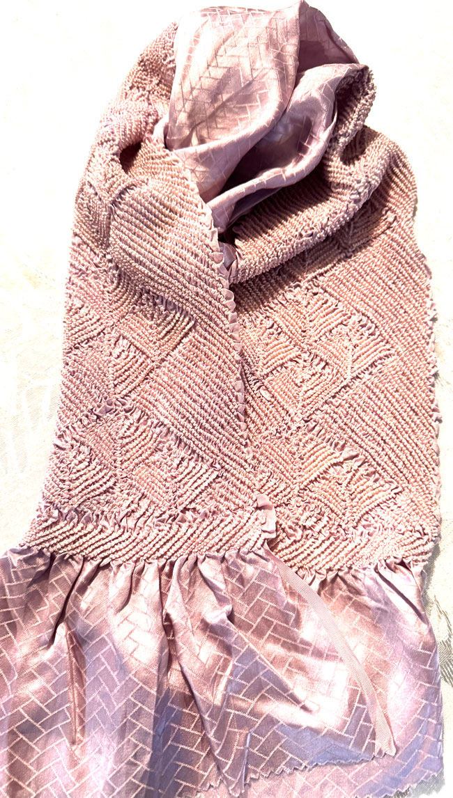 This is a stunning Japanese silk obiage which is commonly worn in western as a neck scarf. It gives warmth in winter and is cool in summer time. It is decorated with intricate shibori dying and is new and has never been worn. The measurements are approximate and dependent on the degree of stretch..