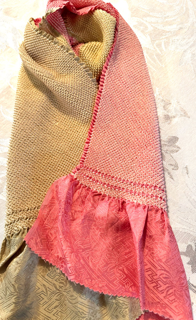 This is a stunning Japanese silk obiage which is commonly worn in western as a neck scarf. It gives warmth in winter and is cool in summer time. It is decorated with intricate shibori dying and is new and has never been worn. The measurements are approximate and dependent on the degree of stretch..