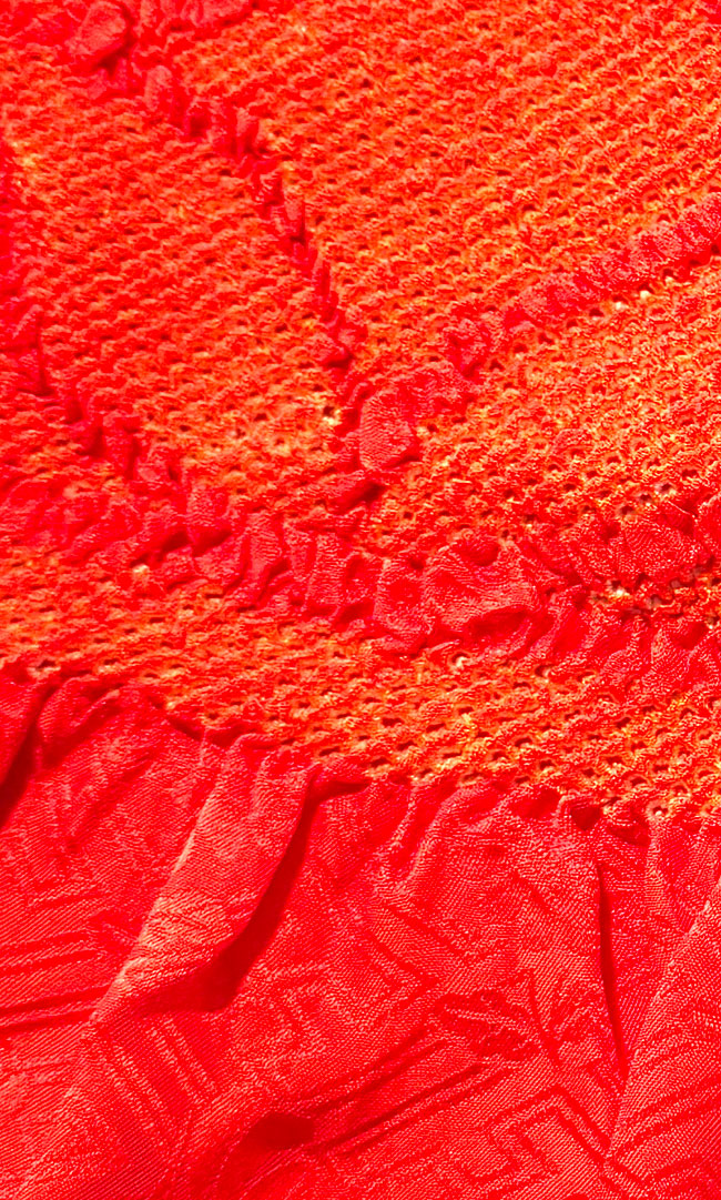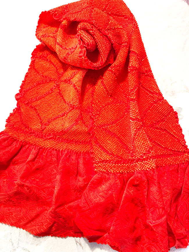 This is a stunning Japanese silk obiage which is commonly worn in western as a neck scarf. It gives warmth in winter and is cool in summer time. It is decorated with intricate shibori dying and is new and has never been worn. The measurements are approximate and dependent on the degree of stretch..