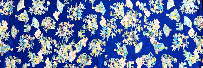 Silky high end kimono synthetic with woven fan pattern under printed traditional Japanese designs.