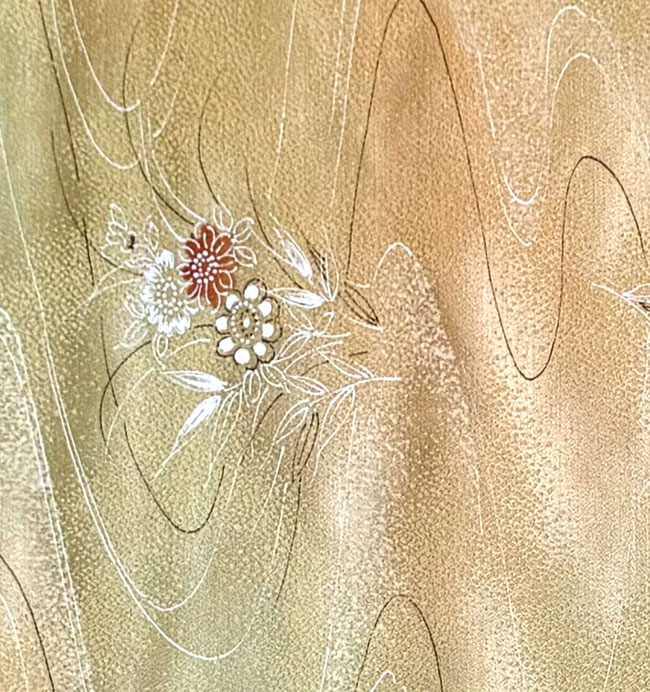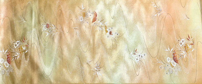 Silky high end kimono synthetic with woven tiny dot pattern under printed stream and floral designs.