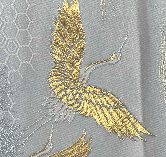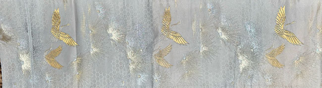 This is a beautiful white silk obi with cranes and pines woven in metal;lic gold threads.Typically, about 70% of the front is patterned and the remainder consists of white silk. The reverse is a plain white silk. It would look terrific as a wall hanging, a table runner or across the end of a bed. This obi does not have a stiff inner core.