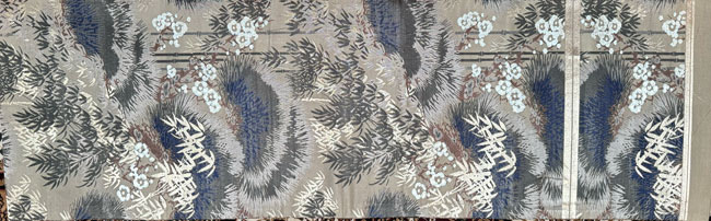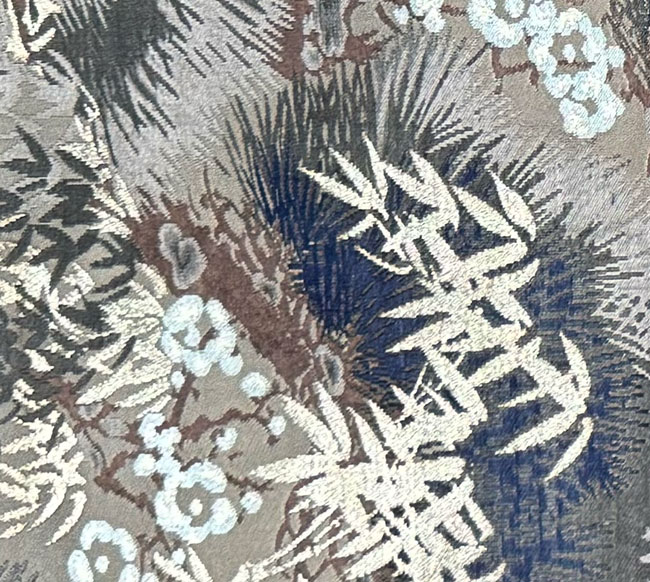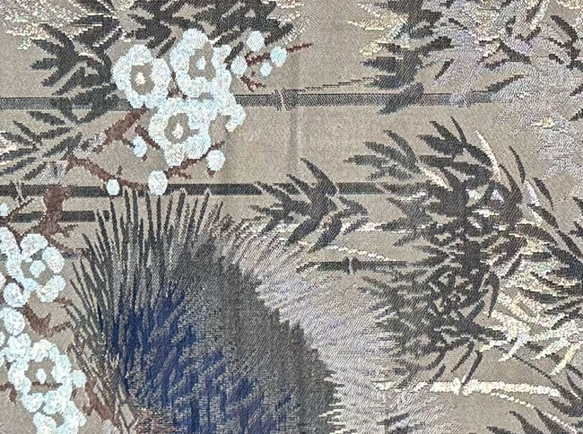 Vintage silk maru obi with traditional woven bamboo, pines and blossoms on a coffee coloured background. There are lots of metallic gold outlines and highlights to make this gorgeous (and heavy)obi shine. It is in great condition. Wonderful obi for hanging, drape across a bed or to dress up a table. The front and reverse of this obi are of the same patterned fabric.