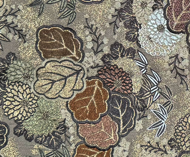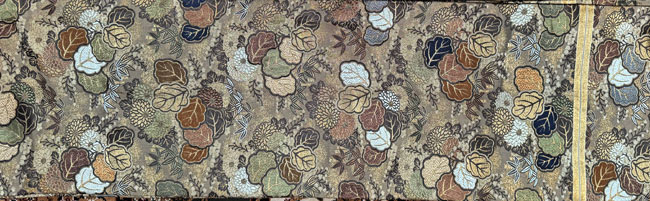 Vintage silk maru obi with traditional woven flowers and leaves on a coffee coloured background. There are lots of metallic gold outlines and highlights to make this gorgeous (and heavy)obi shine. It is in great condition. Wonderful obi for hanging, drape across a bed or to dress up a table. The front and reverse of this obi are of the same patterned fabric.