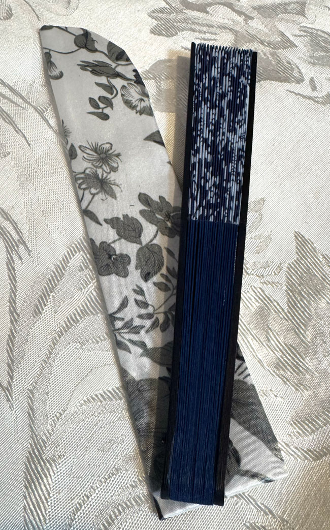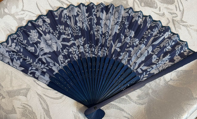 Bamboo and fabric fan with satin floral cover. Cover and closed fan are about 9 inches in length and the span of the fan is about 15 inches.