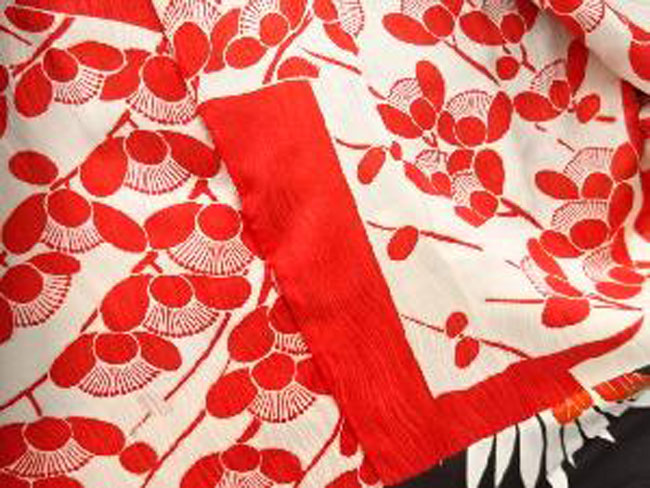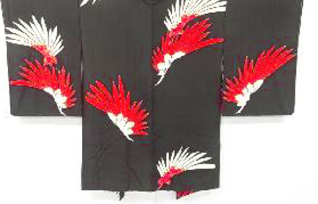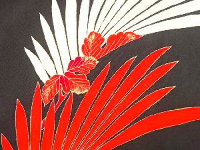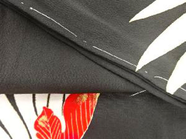 This is a fine black silk woman's kimono with red and white flowers outlined in fine gold. The silk lining is vibrant. It measures 50 inches from cuff to cuff and is 34 inches in length. It would comfortably fit an Australian size 8 - 14.