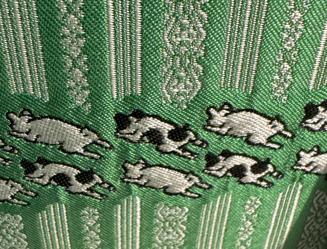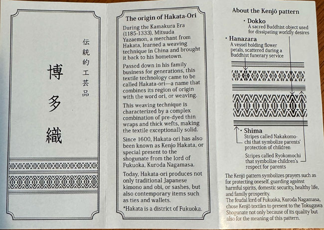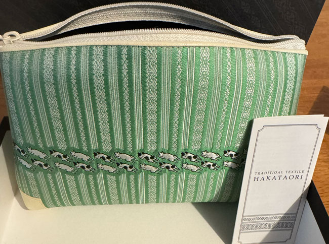 This is a new Japanese finely woven purse which can be used for cosmetics, medications or other. It is beautifully made with reinforced corners in a cream leatherette which also trims the sturdy zipper. It appears to be waterproof as it has a black leatherette inner which is bound to the outer fabric. The outer fabric features a band of rabbits! It measures 5 x 8 inches.The bag is new and comes with a leaflet explaining the history of the fabric and design. It also comes in a black presentation box.
