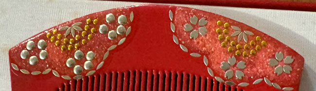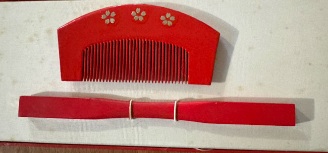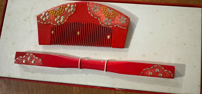 This is a boxed vintage Japanese kanzashi set. It consists of a red wooden comb and hair stick with a hand painted design. There is a lesser design on the reverse. It comes in it's own original box. The box measures 4 x 10 inches.