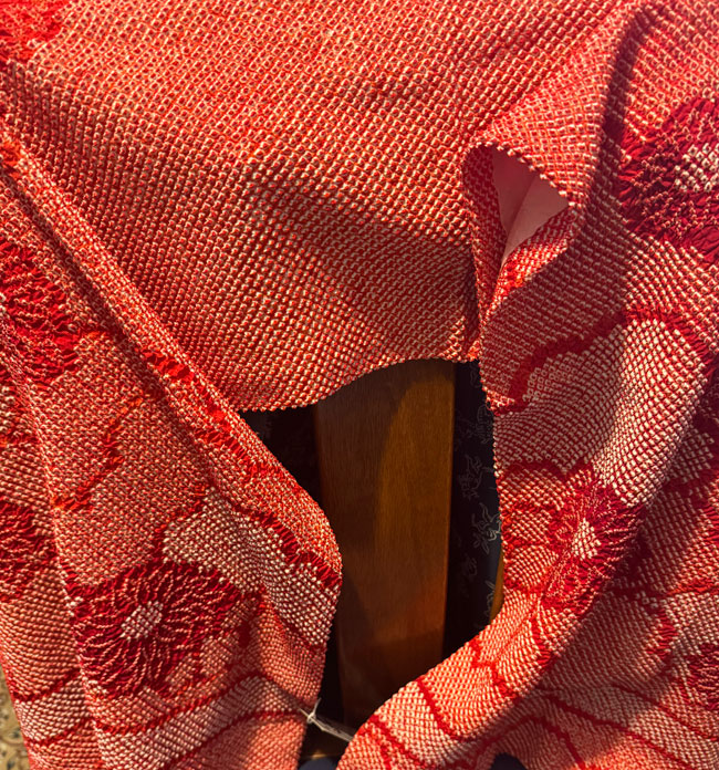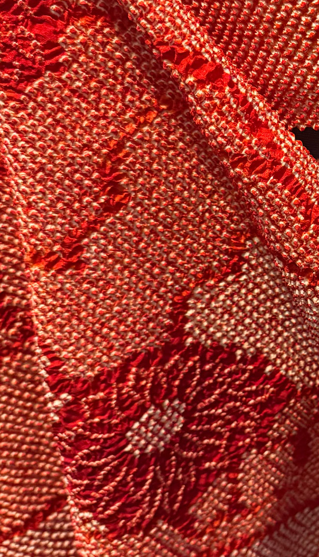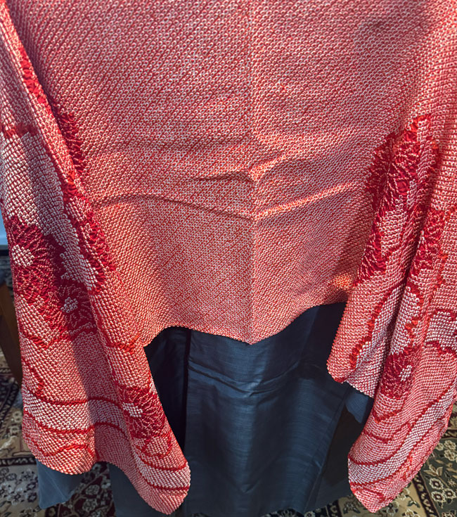 This is a new, lined Japanese silk shibori shawl, or it could be worn as a scarf. It is 18 inches wide and a generous 60 inches in length. It is a rich red silk and shibori dyed. It is new and has never been worn.