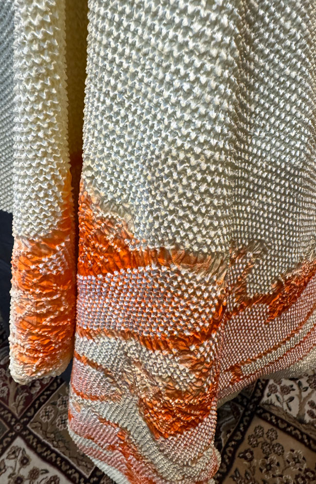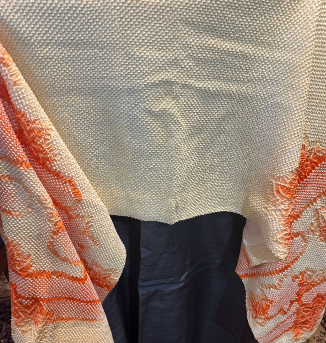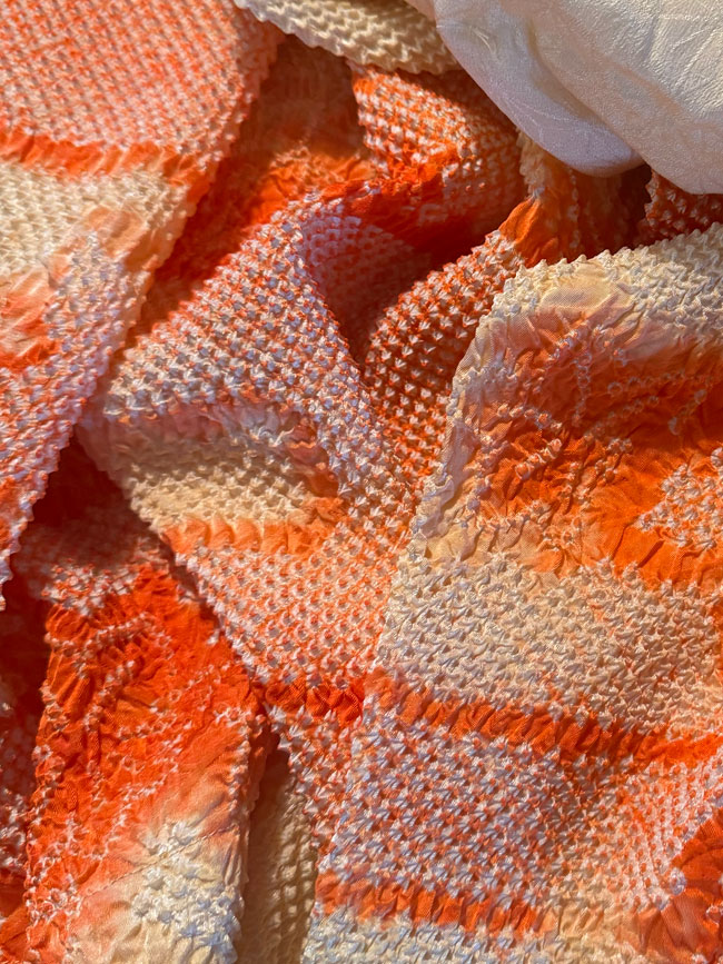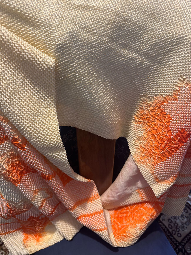 This is a new, lined Japanese silk shibori shawl, or it could be worn as a scarf. It is 18 inches wide and a generous 60 inches in length. It is a rich orange silk and shibori dyed. It is new and has never been worn.
