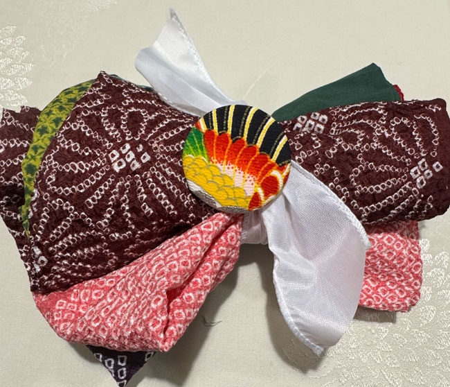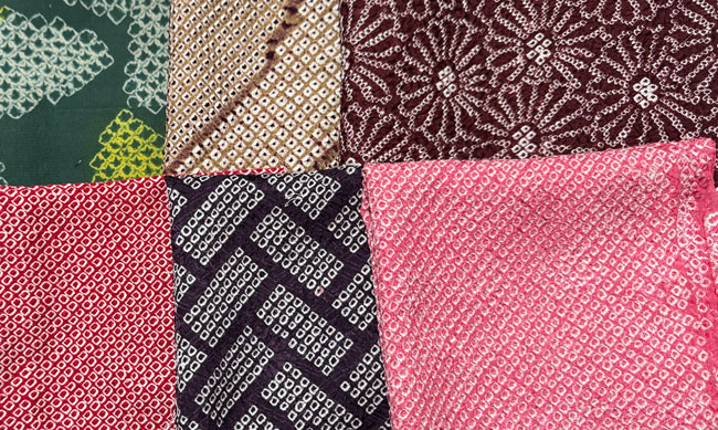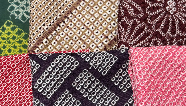 This is a pack of six pieces of silk shibori dyed kimono fabrics, all different and all measuring 14 x 14 inches or the equivalent.You will receive the same fabrics that appears in the images. It comes wrapped in a white ribbon secured with a 45mm kimono silk covered button brooch.