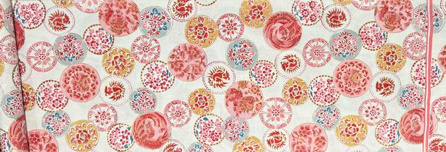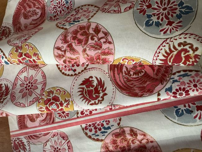 Cotton obi bolt with china plate pattern in red shades and with some metallic gold highlights.