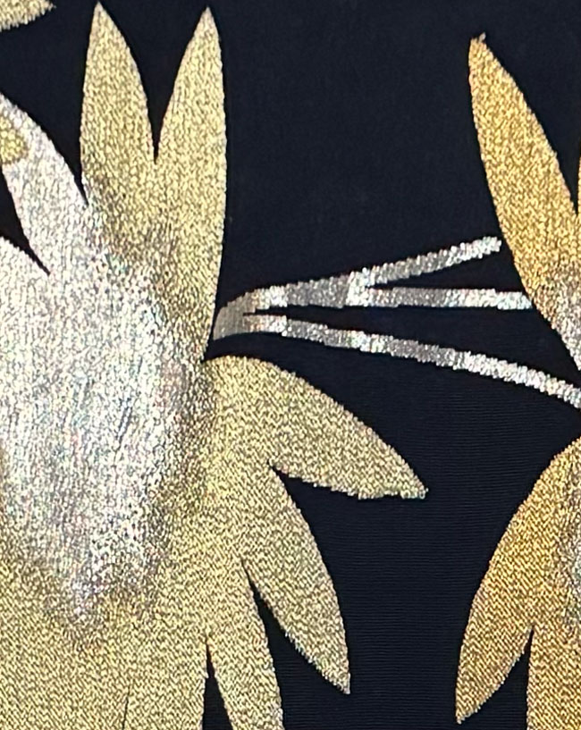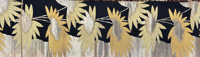 This black silk obi is woven with large gold and silver flowers.Typically, about 70% of the front is patterned and the remainder consists of black silk. The reverse is also a black silk. It would look terrific as a wall hanging, a table runner or across the end of a bed. This obi does not have a stiff inner core.