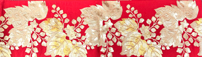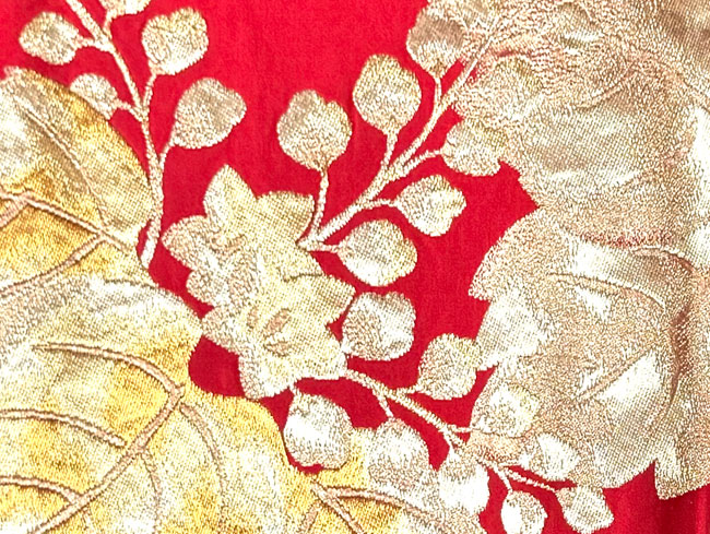 Bright red silk fukuro obi with woven metallic gold leaf and berry design.This obi is in great condition. Wonderful obi for hanging, drape across a bed or to dress up a table. The reverse is plain red silk.