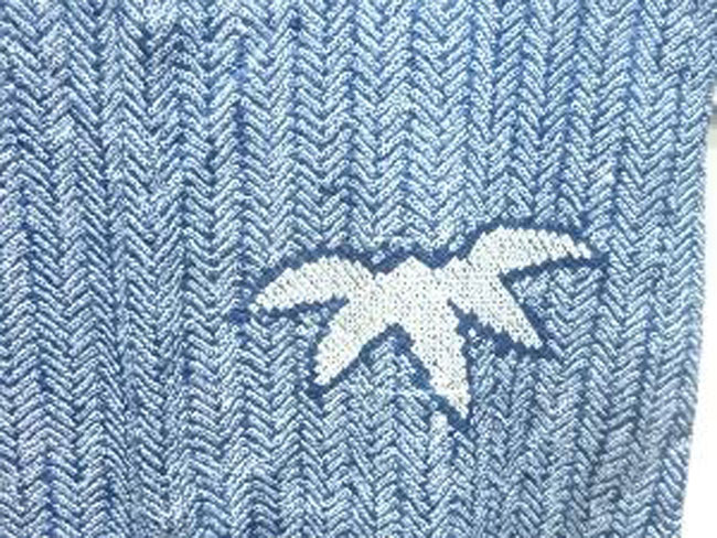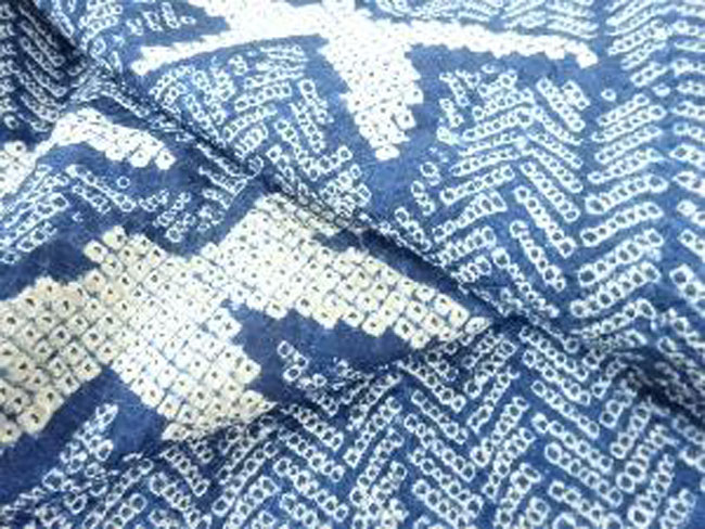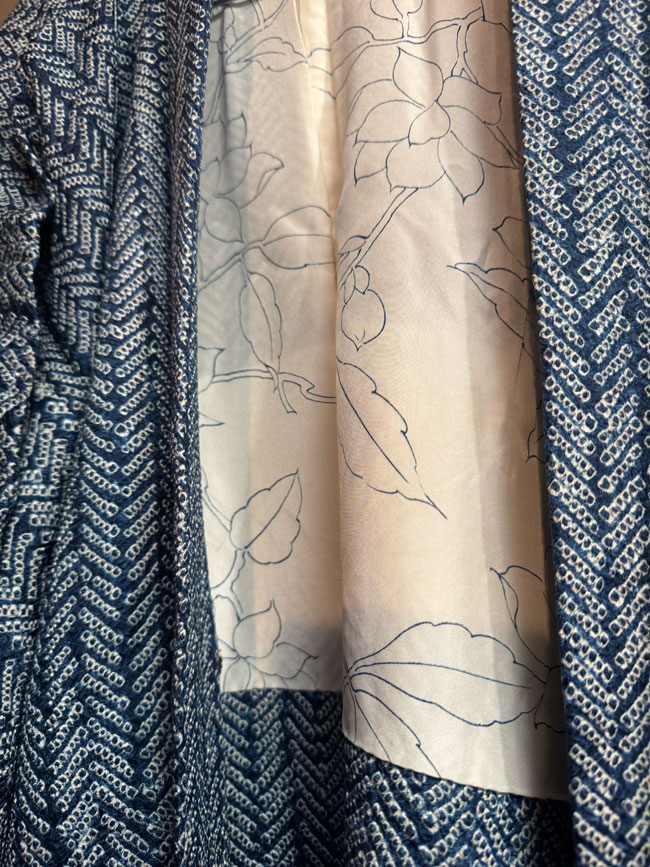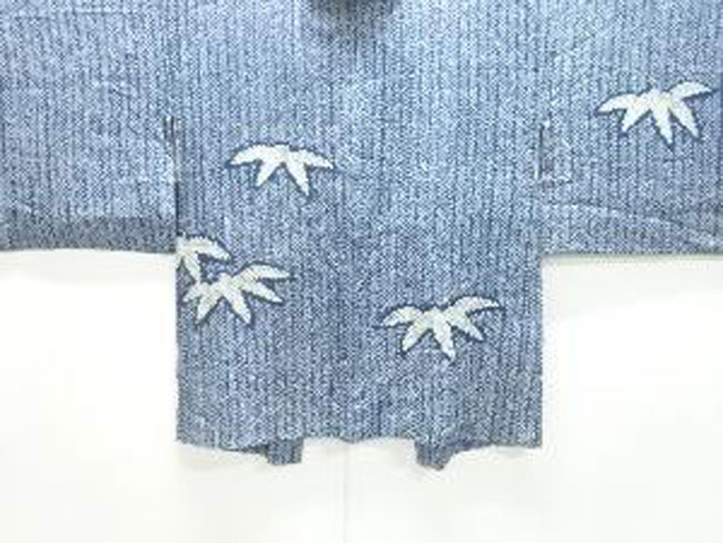 Lovely mid blue silk shibori haori with bamboo leaf pattern. It has a beautiful full silk lining and hand woven blue silk ties. It is 31 inches long and 50 inches from cuff to cuff.