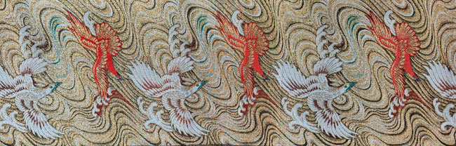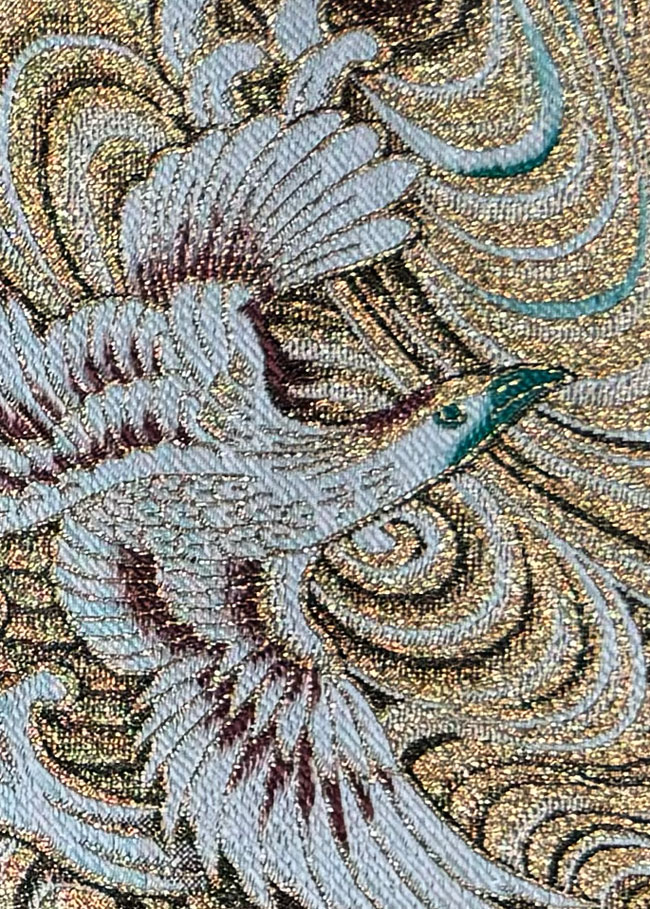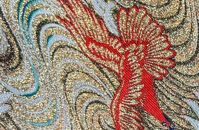165 inch obi bolt. 80 inches is patterned and the remainder is plain back silk.Lots of shiny metallic gold threads.