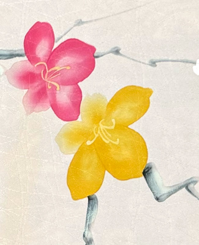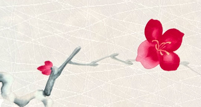 Stunning soft and silky cream kimono silk with dyed cherry blossoms and an all over abstract self woven pattern.