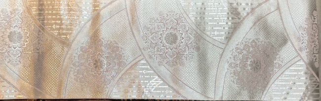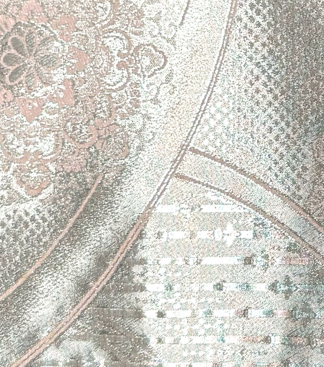 Silvery silk obi bolt with woven silver and pale pink motifs. The bolt is 185 inches in length and the entire length is patterned on one side.