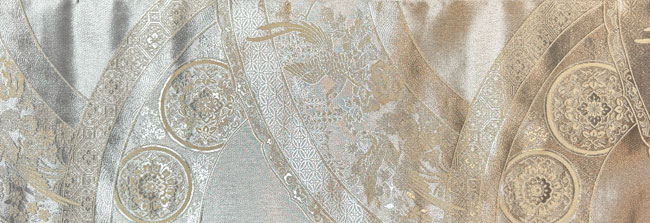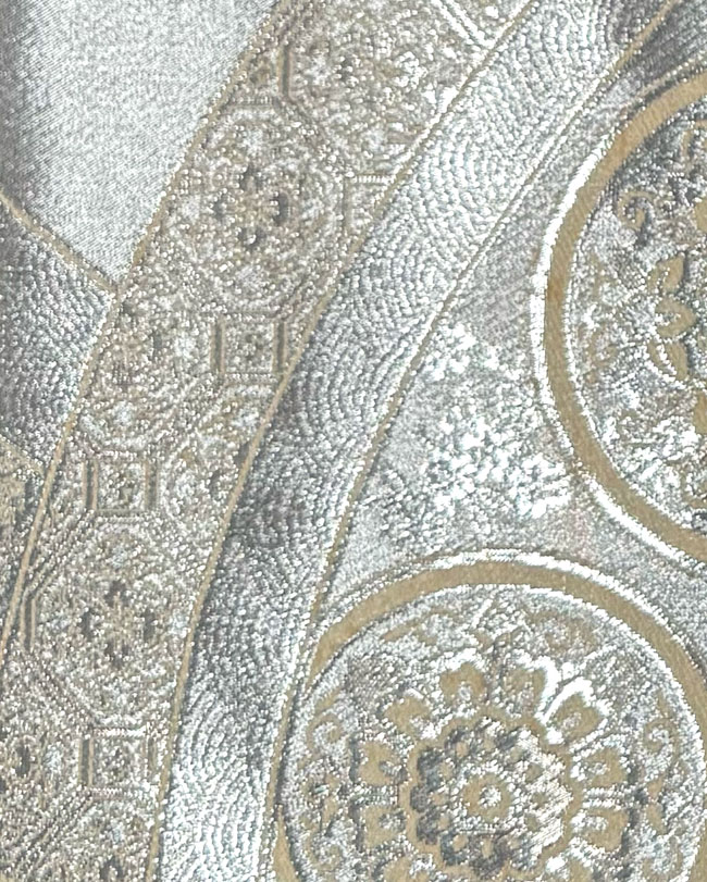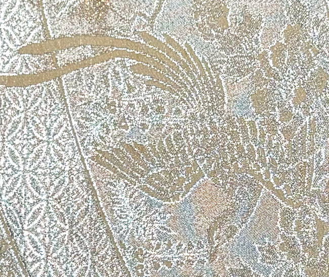 Silvery silk obi bolt with woven silver and cream motifs and birds. The bolt is 185 inches in length and the entire length is patterned on one side. The reverse side is marked with age spots which does not appear to affect the front of the bolt.
