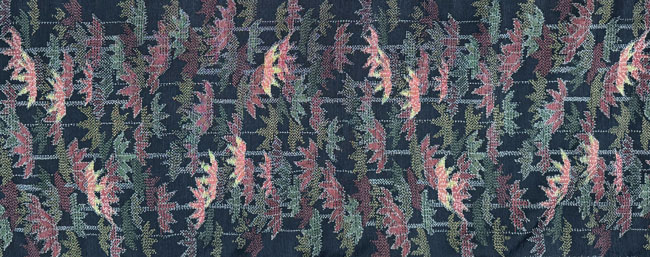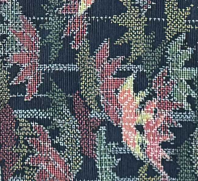 Stunning black tsumugi silk with woven red and green bamboo. Fully reversible ikat.