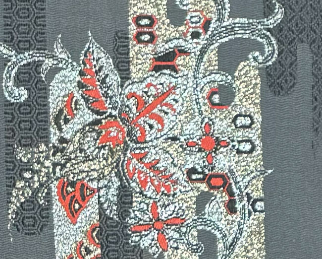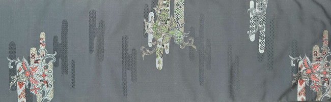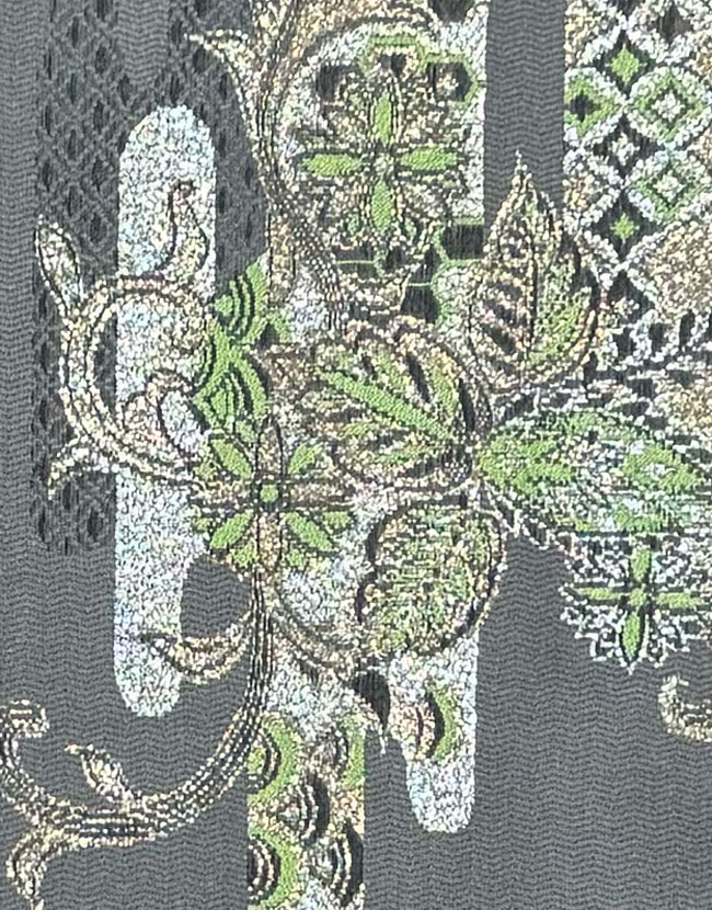 Steel grey silk with tiny zig all over woven design and woven streams in metallic silver . Over embroidered on the silver streams are pink and green leaf and floral patterns.